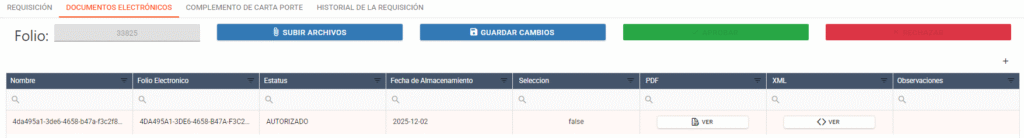Al dar click en el apartado de «Documentos Eléctronicos» se mostrará una pantalla para poder subir el XML Y PDF de la factura en caso de que se encuentre activa la opción de «Recibiré factura» o un PDF en caso de que no.