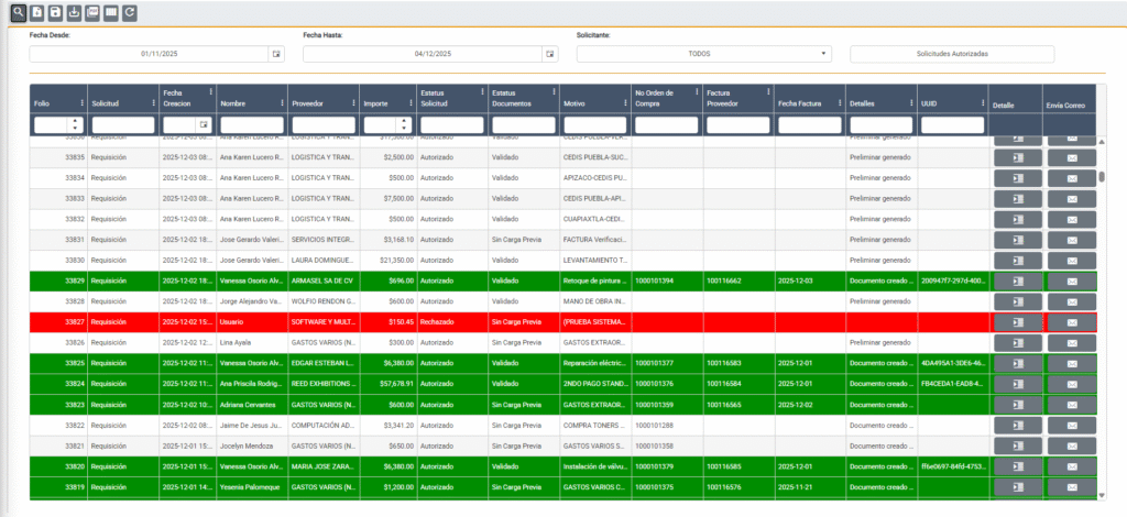 Verde: La solicitud de requisición ya cuenta con una orden de compra generada en SAP